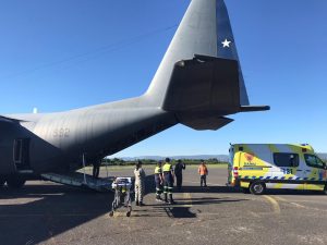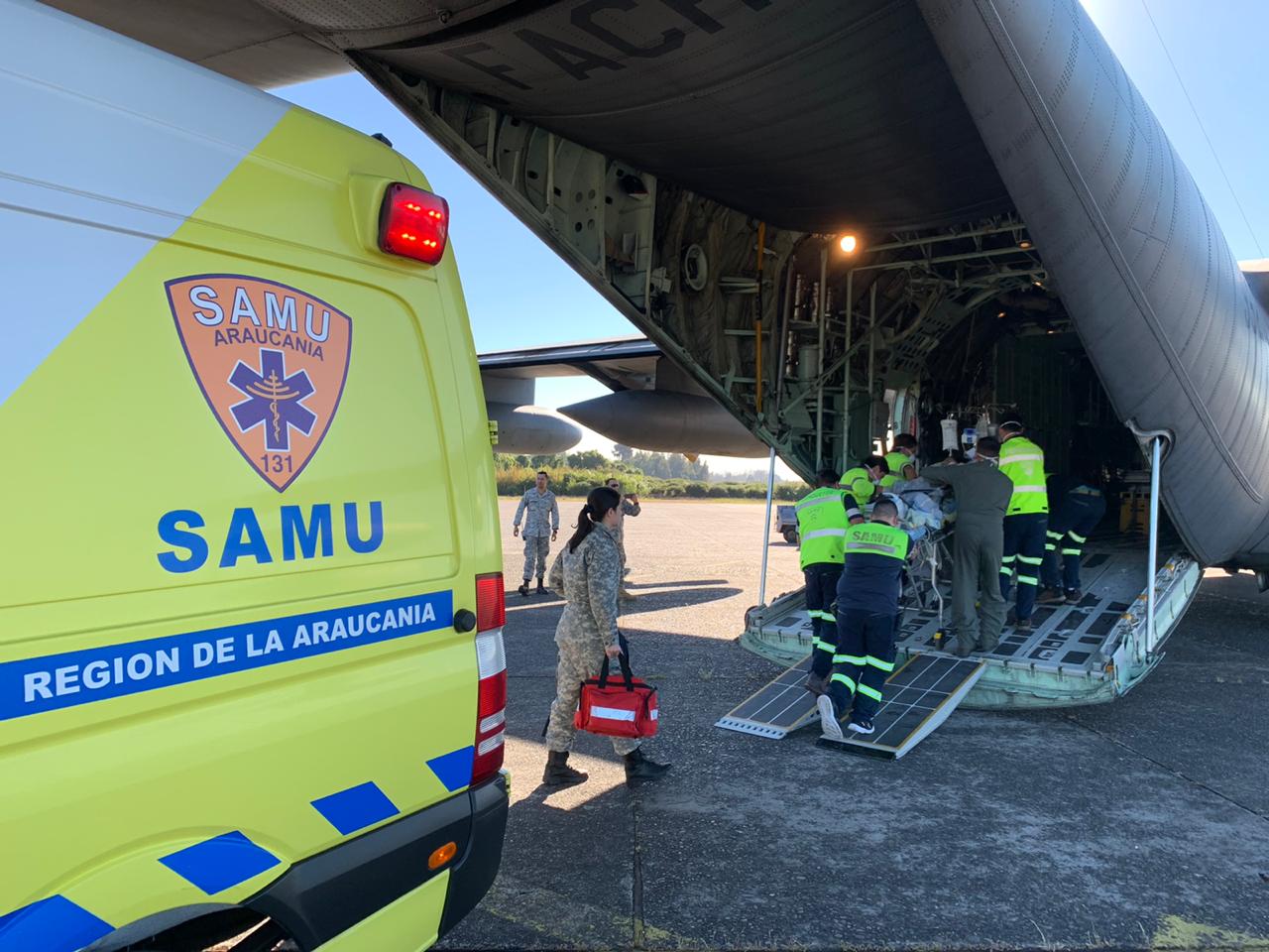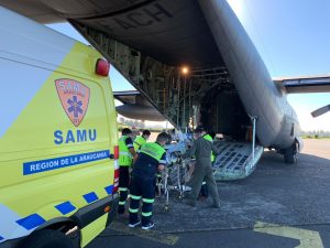 Este martes 12 de noviembre, la Fuerza Aérea de Chile realizó una evacuación aeromédica desde la Base Aérea Maquehue en Temuco hasta la Base Aérea Pudahuel en Santiago de un menor diagnósticado con una complicación respiratoria producto de un síndrome cardiovascular. El traslado lo realizó un avión KC-130R de dotación de la IIª Brigada Aérea, en coordinación con el SAMU Araucanía.