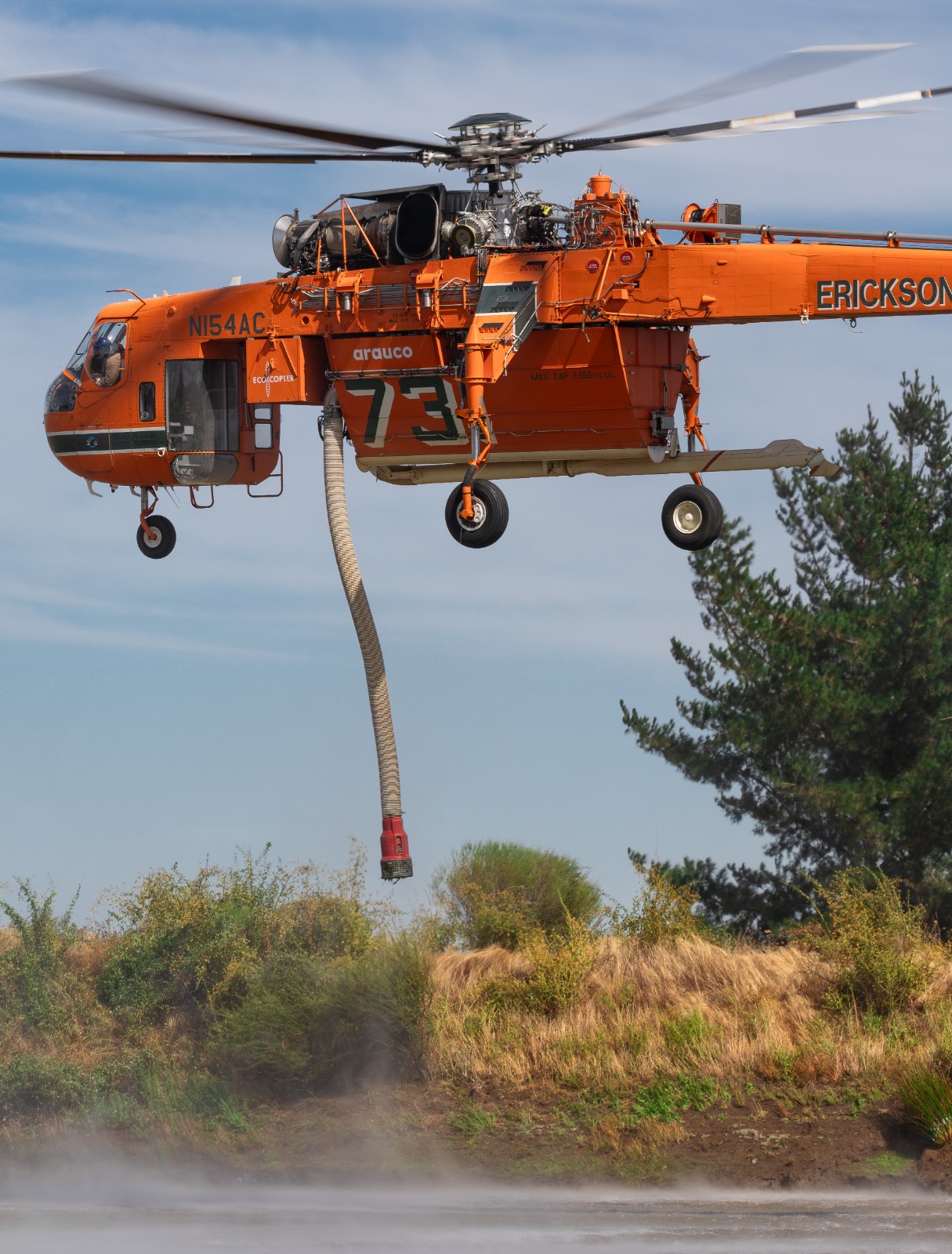 Para el combate de incendios de gran envergadura, la compañía dispondrá de dos helicópteros Aircrane, considerados como los gigantes en la extinción aérea. Con una capacidad de lanzamiento de 10 mil litros de agua por descarga, estas aeronaves ya están operativas en las regiones de Ñuble y Biobío. Su rol es fundamental para controlar y extinguir frentes de fuego de alta intensidad, ofreciendo un poder de supresión masivo y decisivo.
