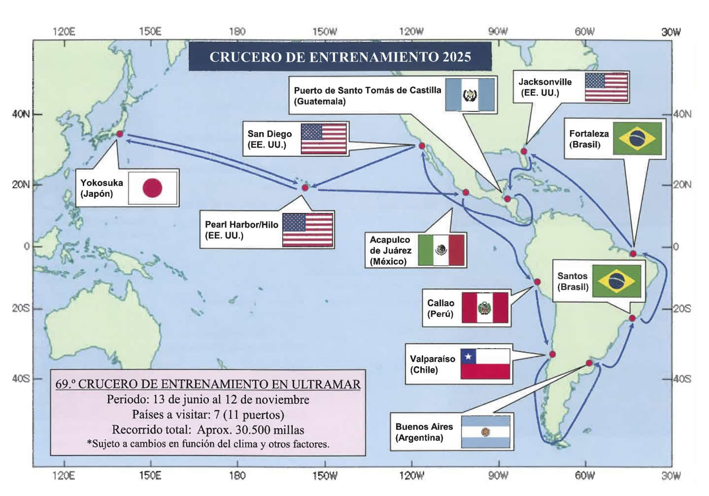 El Escuadrón zarpó del puerto japonés de Yokosuka el 13 de junio y su itinerario comprende recaladas en Estados Unidos (San Diego, Jacksonville, Pearl Harbor e Hilo), Argentina (Buenos Aires), Guatemala (Puerto Santo Tomás de Castilla), Chile (Valparaíso), Brasil (Santos y Fortaleza), Perú (Callao) y México (Acapulco).
