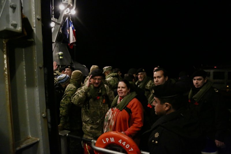 Luego de aproximadamente 8 horas de navegación, las unidades de la US Navy arribaron a la capital de la Región de Magallanes y la Antártica Chilena para quedar “a la gira” a la altura del muelle Prat. Acto seguido, autoridades nacionales, lideradas por la Ministra de Defensa, Maya Fernández; el Comandante en Jefe de la Armada, Almirante Juan Andrés De la Maza; y representantes del Estado Mayor Conjunto y del Ministerio de Relaciones Exteriores, además de autoridades locales, abordaron la unidad para sostener un encuentro protocolar con los mandos de esta fuerza de tarea norteamericana.